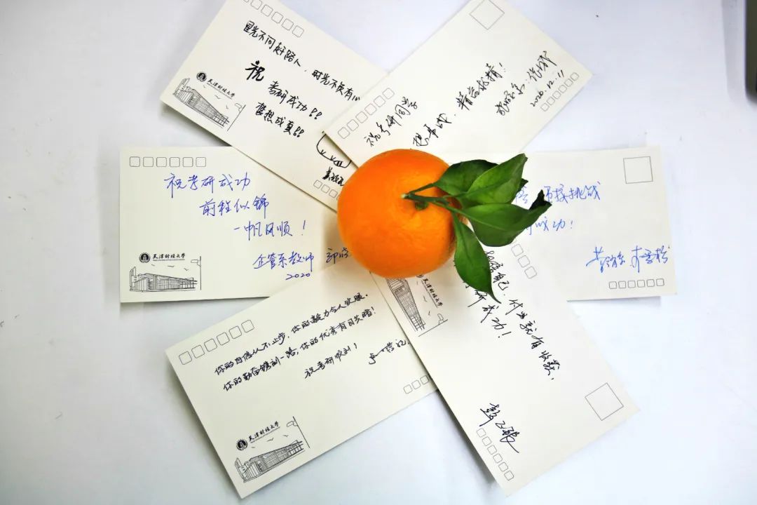 天蒙蒙亮,助力展台已经准备就绪,学院为考研学子精心准备了考研福袋内含脐橙一个,手写明信片一张,以及考研文具一套。金灿灿的橙子,寓意着大家心想事成,考研成功!学院老师们手写的明信片体现出对考研学子的鼓励与殷切希望。小小的福袋祝福大家考试顺利,万事如愿!