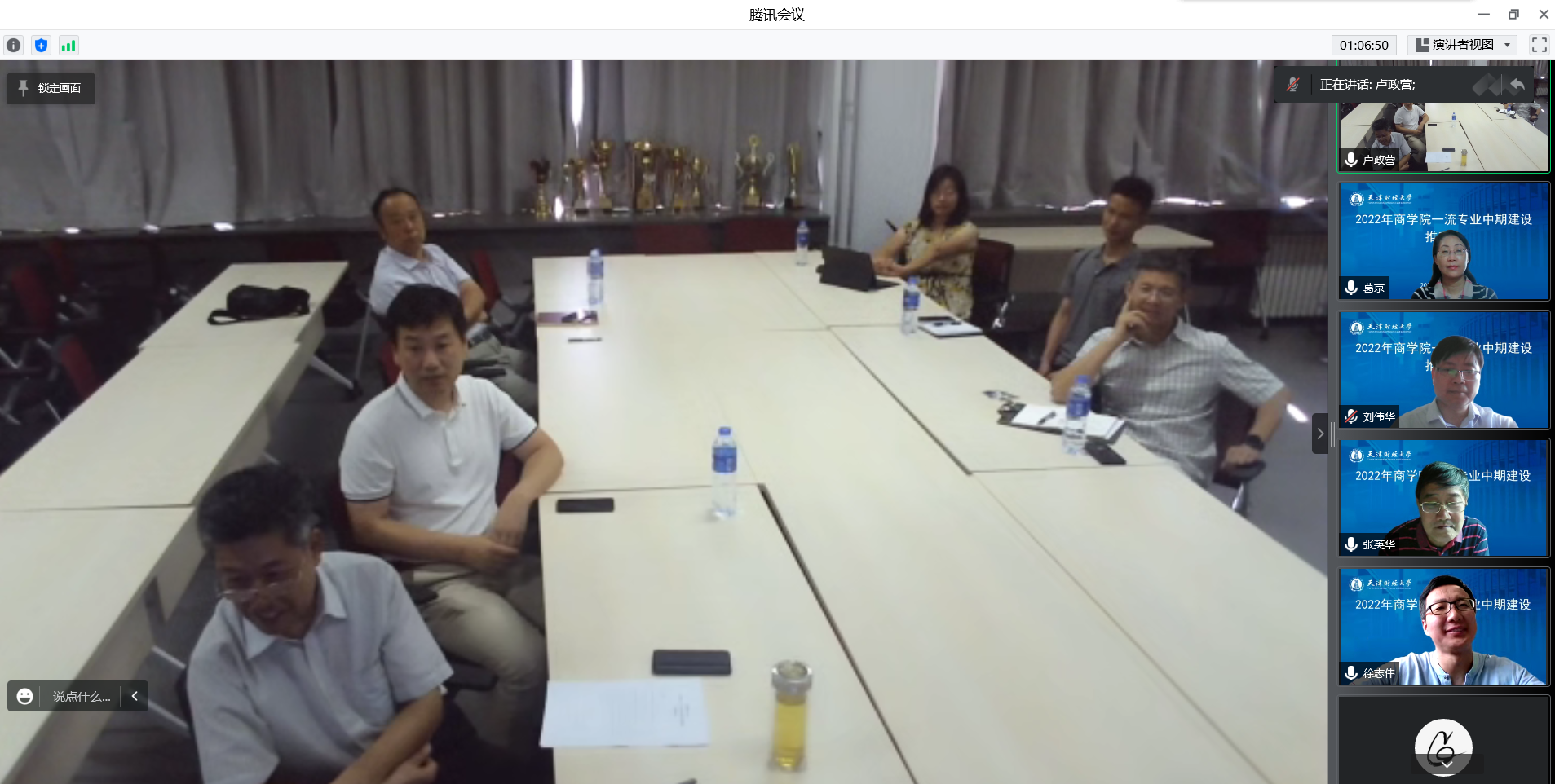 五位系主任陈颉、王海霞、张初兵、秦娟娟、张威从专业的历史沿革、师资队伍、课程建设、教研教改、实践教学、学生培养等方面,分别对工商管理、人力资源管理、市场营销、物流管理、旅游管理五个一流专业的建设情况及未来的工作设想进行了汇报。