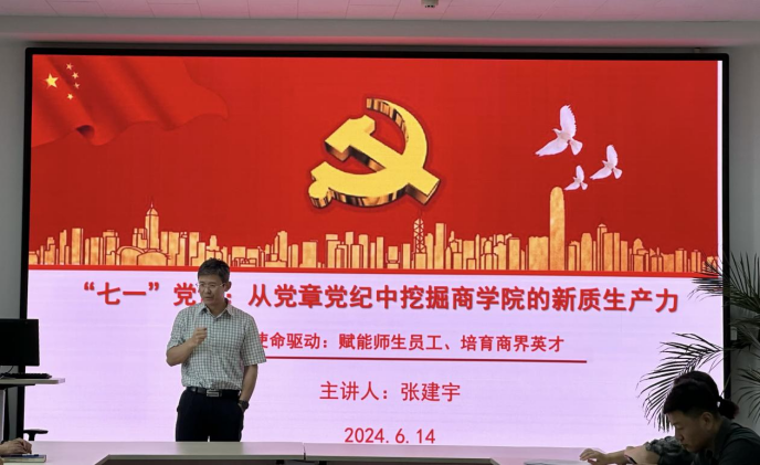 为深入学习贯彻习近平总书记关于党的纪律建设的重要论述,推进党纪学习教育走深走实,引导教师党员践行习近平总书记关于“加快发展新质生产力,扎实推进高质量发展”的指示要求。6月14日,腐漫画 党委副书记、院长张建宇以“从党章党纪中挖掘腐漫画 新质生产力——使命驱动:赋能师生员工,培育商界英才”为主题讲授专题党课。学院领导班子、系主任及全体行政管理干部、学生辅导员参加。