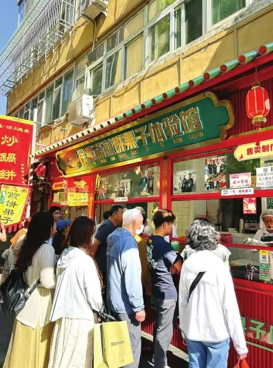 清真南大寺门前的恩庆成李记锅巴菜店里,天津的传统早点应有尽有,进入西北角美食街,最显眼的就是这家。在醒目的招牌下有两个窗口,一是售货口,二是取餐口,购买的顺序为先从售货口购买,再到取餐口取餐,两边队伍都很长,需要排两次,买个早点最少需要20分钟。虽然队伍很长,却是西北角为数不多的较有秩序的队伍。除了这家店,其他店铺不规则地散布在西北角美食街的各条小路上,没有合适的地方排队,购买人群就只能根据“自己的想法”来排。人少一点的,在店门前排成三五个人的队伍;人多一点的,有的横在马路上,有的排到了别家店门前,十分杂乱。人挤人的队伍,无处安放的饥饿的胃。这个“五一”假期,排队长、体验感差,成了很多游客吐槽的重灾区。