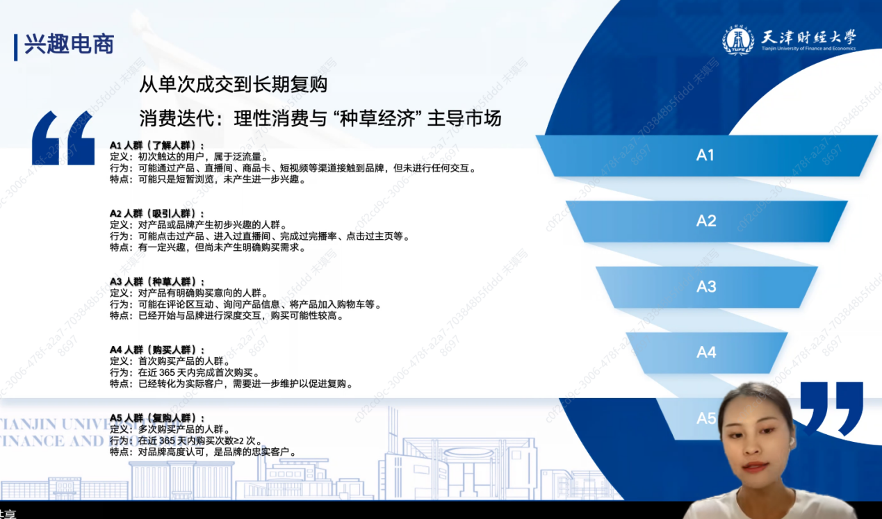 2022级硕士、曾任杭州安步汽车直播运营主管的王忆玮分享。她指出,兴趣电商以“货找人”重构消费链路,形成“技术赋能 - 内容聚合 - 私域沉淀”生态,AI渗透、细分市场崛起等正推动行业变革。