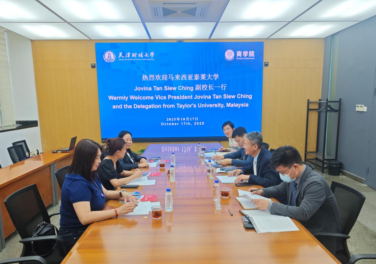 张建宇对泰莱大学代表团的到访表示热烈欢迎,系统回顾了天财建校67年来的办学成就,重点介绍了学校以“开放天财”作为“新财经”战略的核心引擎,在数字会计、绿色金融、智慧供应链、跨境电商等交叉领域构建的“学科-专业-产业链”特色集群。并从AACSB认证进展、国家级一流本科专业建设、数字经济实验室搭建、本硕博纵向贯通人才培养体系等方面介绍了学院的最新成果。胡少培介绍了天财近些年对外合作交流的情况,并表示,马来西亚不仅是“一带一路”倡议在东南亚的核心节点国家,更是中国与东盟深化合作、实现区域互联互通与经贸融合的重要战略支点,而泰莱大学旅游与酒店管理、工商管理、会计与金融等专业与天财优势学科高度契合,期待双方以“学生交换+科研共建+师资互派”三位一体模式,共同培养面向中国-东盟大市场、兼具数字技能与跨文化领导力的未来商界领袖。