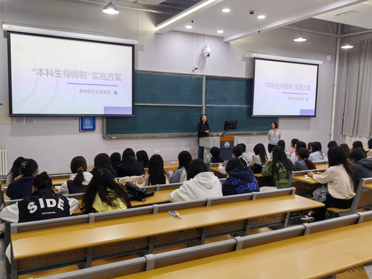 2025年10月17日下午,商学院企业管理系召开了2024级本科生导师制说明会,工商管理(大数据决策实验班)与工商管理专业全体同学参会。高楠主任、朱雅彦副主任分别介绍了“本科生导师制”实施方案,从制度内涵、实施规则和价值意义等维度展开讲解,为“导师-学生”协同成长机制的落地明晰路径。