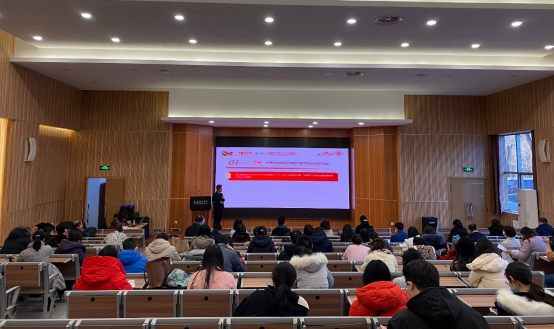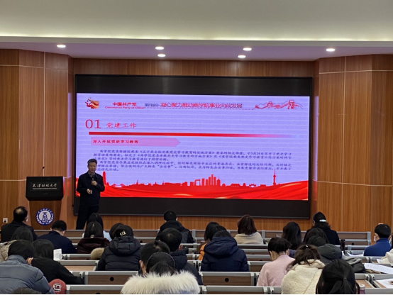 党委书记彭正银在综合楼Z001进行学习贯彻党的十九届六中全会精神宣讲,全体教工参加报告会。