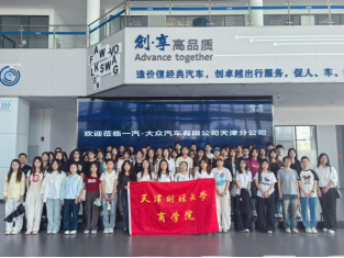 在工作人员的带领下,师生们参观了一汽大众天津分公司的现代化生产线,依次深入了解了焊装、涂装、总装三部分汽车制造的核心工艺流程。上千台库卡机器人在焊接车间精准作业,AGV自动导向搬运车在各组装线有序运送零部件,展现了智能制造的高效与精准。总装车间,机械臂与工人紧密配合,对整车关键部件连接处的间隙和平度值进行精密检查,把好下线前质量关。先进的生产设备、严谨的生产管理以及高效的生产效率,让师生们对汽车制造行业有了全新的认识。