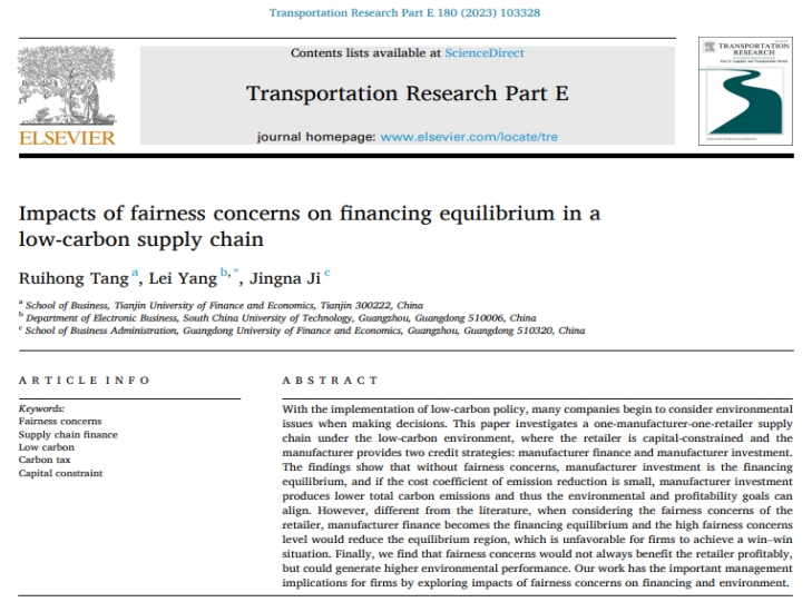 物流与供应链管理系唐瑞红博士在英文期刊《Transportation Research Part E: Logistics and Transportation Review》发表题为“Impacts of fairness concerns on financing equilibrium in a low-carbon supply chain”(公平关切对低碳供应链融资均衡的影响)的论文。