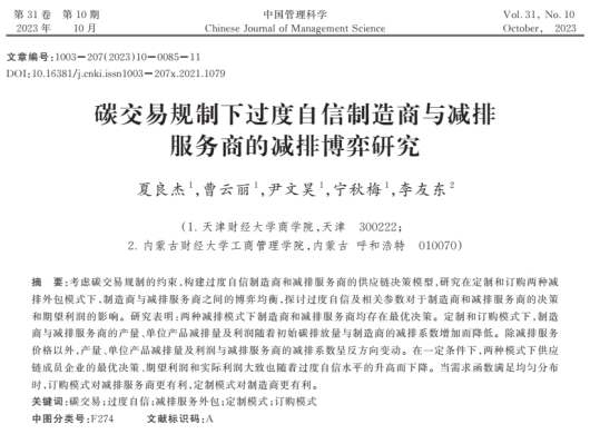 物流与供应链管理系夏良杰教授与硕士生曹云丽、尹文昊和本科生宁秋梅在中文高水平期刊《中国管理科学》合作发表题为“碳交易规制下过度自信制造商与减排服务商的减排博弈研究”的论文。