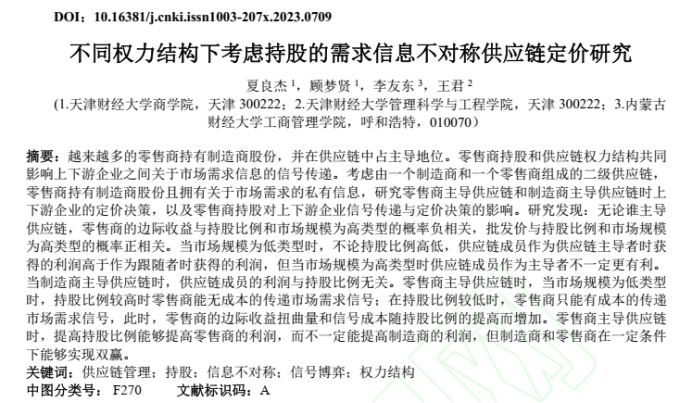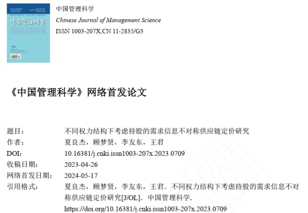 物流与供应链管理系夏良杰教授与硕士生顾梦贤合作的论文“不同权力结构下考虑持股的需求信息不对称供应链定价研究 ”在中文高水平期刊《中国管理科学》网络首发。