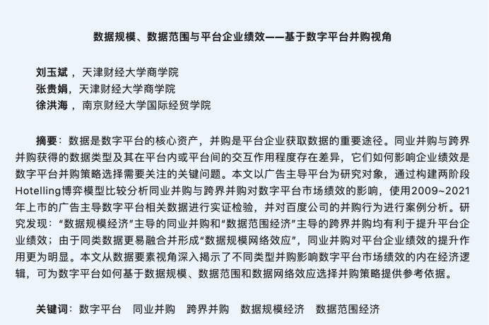 物流与供应链管理系刘玉斌教授和张贵娟博士、南京财经大学国际经贸学院徐洪海老师合作在中文高水平期刊《数量经济技术经济研究》发表题为“数据规模、数据范围与平台企业绩效——基于数字平台并购视角”的论文。