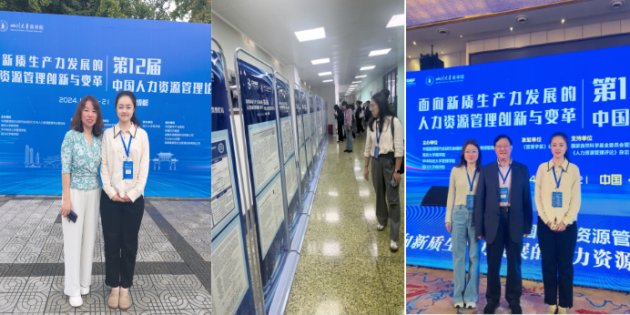 与会期间,王海霞老师与四川大学、重庆大学、西南财经大学等人力资源管理领域的专家学者共同探讨人力资源管理的课程建设、人才培养、项目申报和论文发表等问题,分享宝贵的实践经验和理论指导。刘宏波老师在海报张贴环节展示了论文《基于后致视角的共享型领导涌现机理研究》,并与参会者就论文相关内容进行了深入交流。该论文构建了共享型领导涌现机理多层次模型并进行实证检验,得出共享型领导会通过跨层面的“特质→状态和行为→感知”路径涌现,论证了人际互动中的能力感知在领导力涌现中的重要作用。