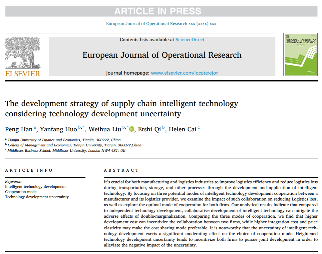 物流与供应链管理系韩鹏博士以第一作者身份与天津大学霍艳芳教授、刘伟华教授、齐二石教授以及英国密德萨斯大学Helen Cai教授合作,在英文ABS四星级期刊European Journal of Operational Research在线发表题为“The development strategy of supply chain intelligent technology considering technology development uncertainty”的学术论文。