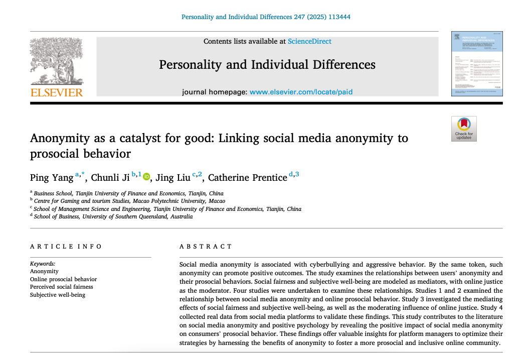 市场营销系杨萍老师和研究团队在心理学领域国际权威期刊Personality and Individual Differences上发表论文“Anonymity as a catalyst for good: Linking social media anonymity to prosocial behavior”。