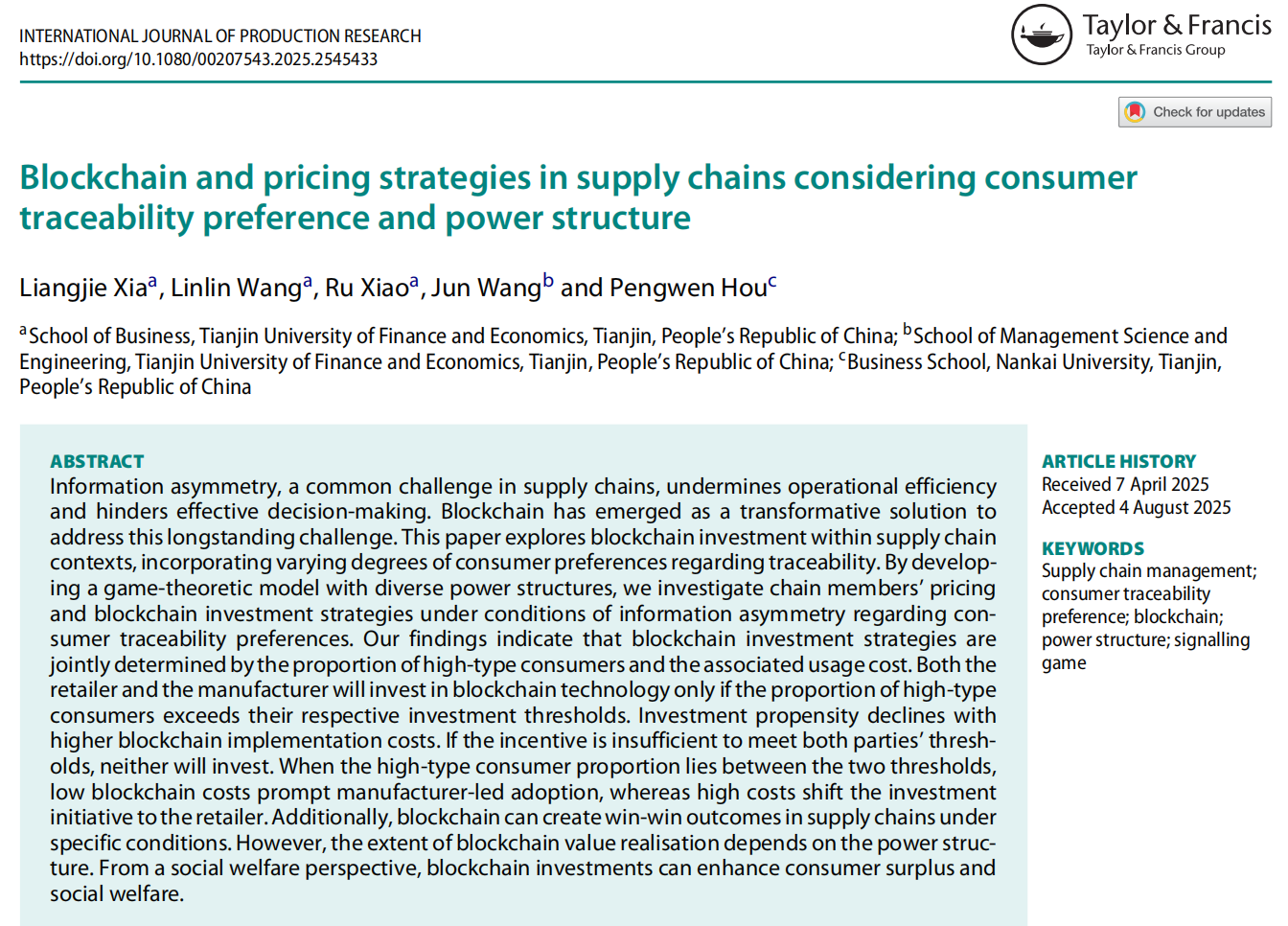 Liangjie Xia, Linlin Wang, Ru Xiao, Jun Wang & Pengwen Hou (2025). Blockchain and pricing strategies in supply chains considering consumer traceability preference and power structure[J]. International Journal of Production Research: 1-20.