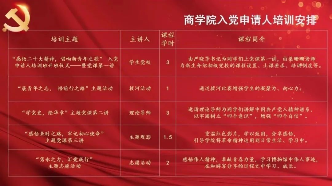本学期的培训课程分为十讲,共计24学时,修满全部24学时课程准予结业,涉及的相关课程包括开班仪式、入党流程培训、拔河比赛、理论导师讲座、志愿活动、主题观影与结业汇报展示等部分。本次开班仪式简要阐明了结业的相关要求。在纪律方面,强调了培训将记录每位同学的出勤情况,希望同学们能够认真遵守培训纪律,按时出勤,及时完成学习任务,圆满结业。